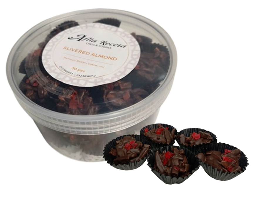 Chocolate Slivered Almond …. Badam hiris yang di panggang dengan sempurna dan di salut dengan coklat premium